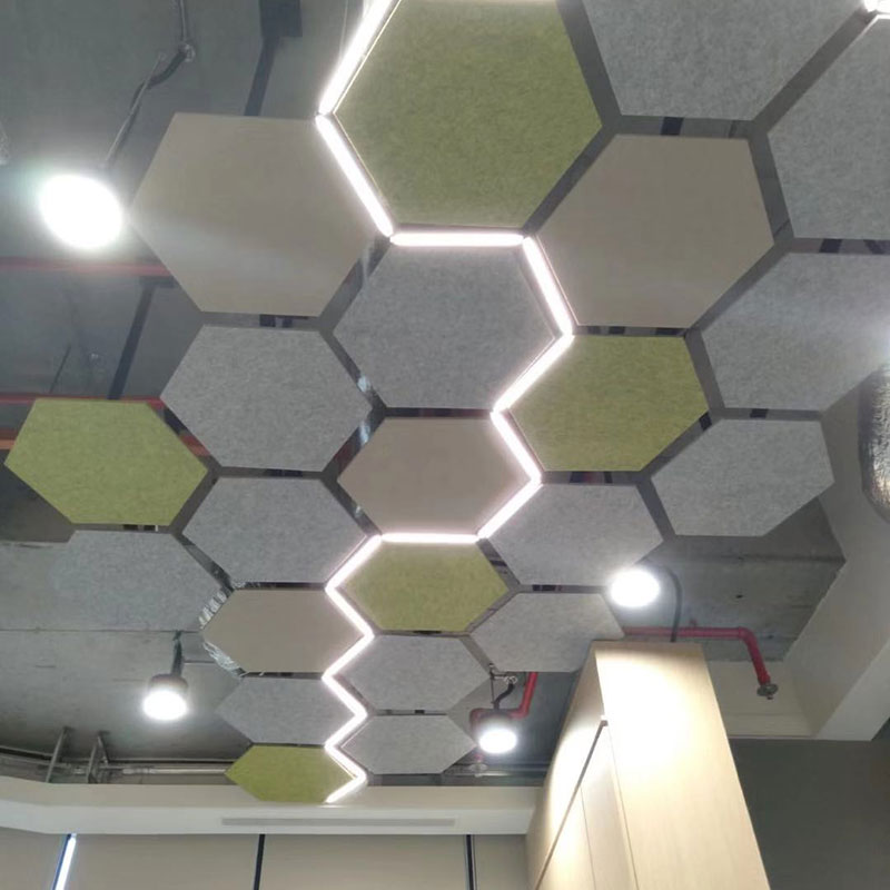PET 음향 천장 패널은 니들 펀칭 가공으로 폴리에스터 100%로 만들어집니다. 생산 공정은 완전히 물리적 및 친환경적이며 폐수, 배출, 폐기물이 없습니다. 무접착, 다공질 음향패널의 특성으로 방음, 단열, 무독성, 무알레르기, 무자극, 포름알데히드 바인더가 포함되어 있지 않고 NRC가 높음: 0.85